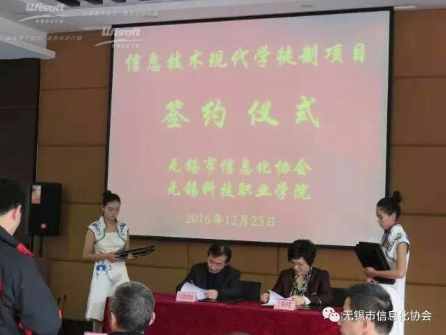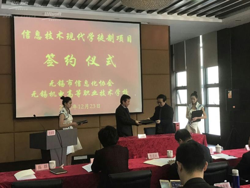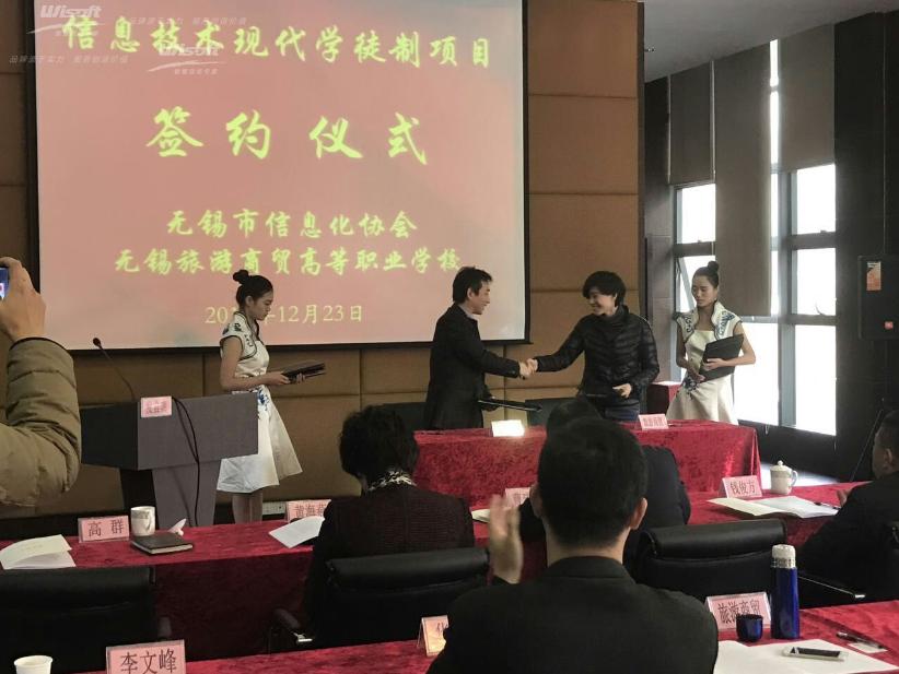 12月23日,无锡市信息化协会现代学徒制工作委员会(简称:信学工委)筹备成立大会在无锡科技职业学院顺利召开,同时为协会首块“专家工作站”举行揭牌仪式。本次会议由无锡市信息化协会副会长曹建林主持,参加会议的主要领导有:无锡市科学技术协会副主席钱俊方,无锡市信息化和无线电管理局张观涛,江苏中科惠软信息技术有限公司总经理李文峰,红豆集团信息中心主任奚峰,无锡机电高等职业技术学校校长王稼伟,无锡市信息化协会秘书长华希凡,以及相关信学工委委员近40余人参加本次会议。
