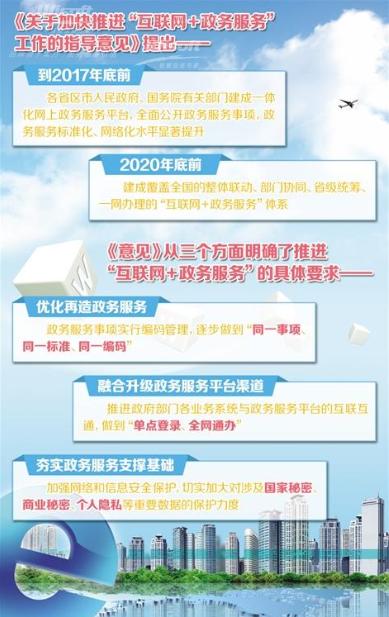 9月29日,国务院《关于加快推进“互联网+政务服务”工作的指导意见》发布。《指导意见》提出,到2017年底前,各省区市人民政府、国务院有关部门建成一体化网上政务服务平台,全面公开政务服务事项,政务服务标准化、网络化水平显著提升。2020年底前,建成覆盖全国的整体联动、部门协同、省级统筹、一网办理的“互联网+政务服务”体系,大幅提升政务服务智慧化水平,让政府服务更聪明,让企业和群众办事更方便、更快捷、更有效率。