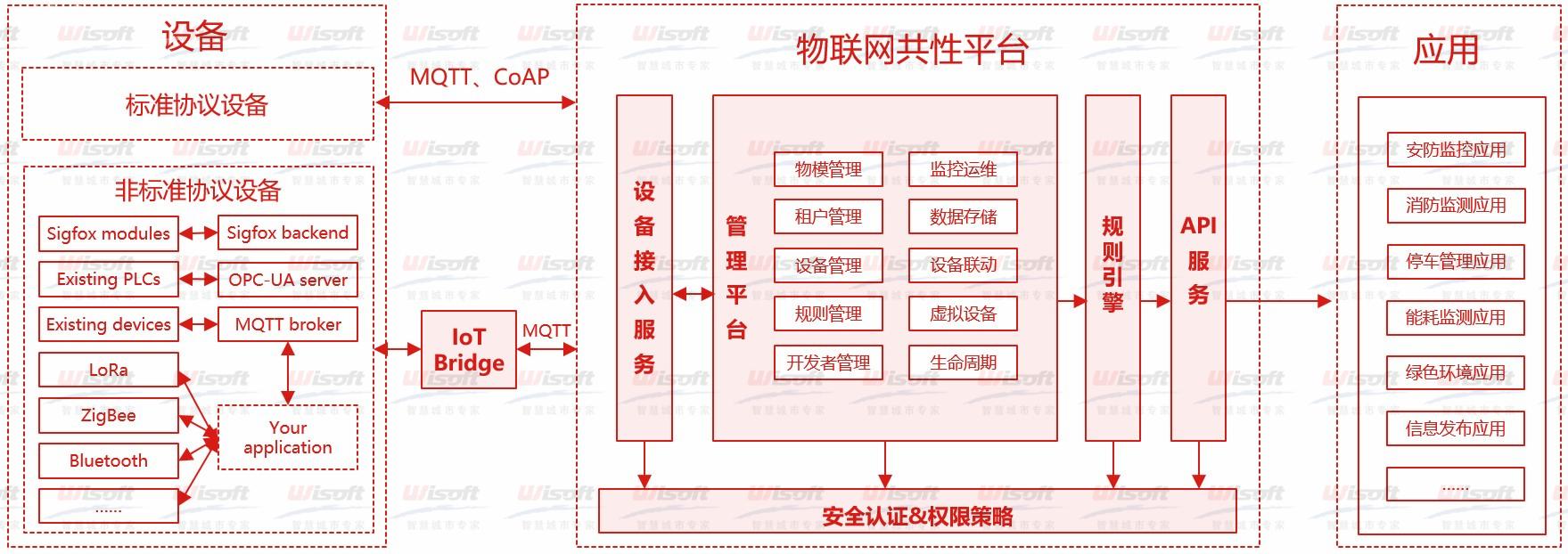 物联网共性平台通过对所有物联网接入设备以统一标准的数据协议格式向上层应用提供开发服务,达到设备和应用解耦的目的,使得应用开发无需面向具体设备厂家的协议格式,即设备厂家在无需修改应用时,也可实现设备即装即用、互相兼容、互联互通。