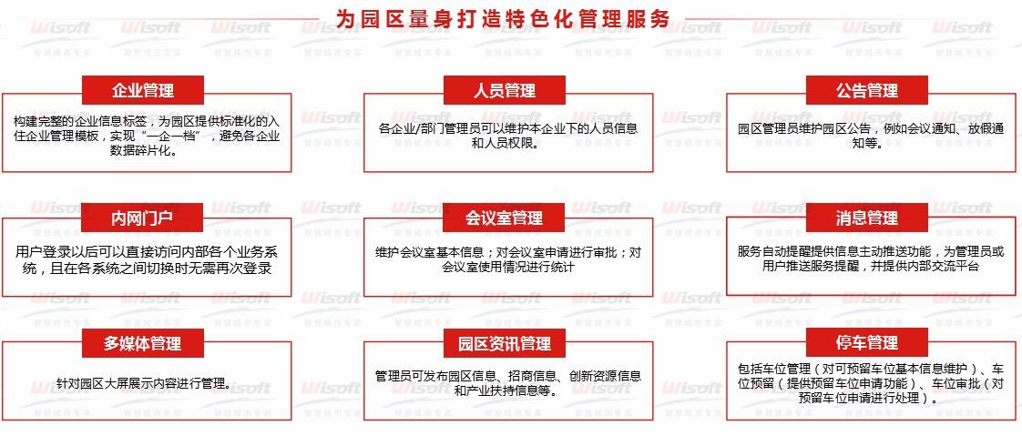 建设园区统一管理平台,通过业务对接,系统提供一站式服务,通过统一规划、统一标准,接入园区其他管理软件,用户进入园区管理平台,只需选择需要操作的软件平台及自行跳转,大大的方便园区管理。