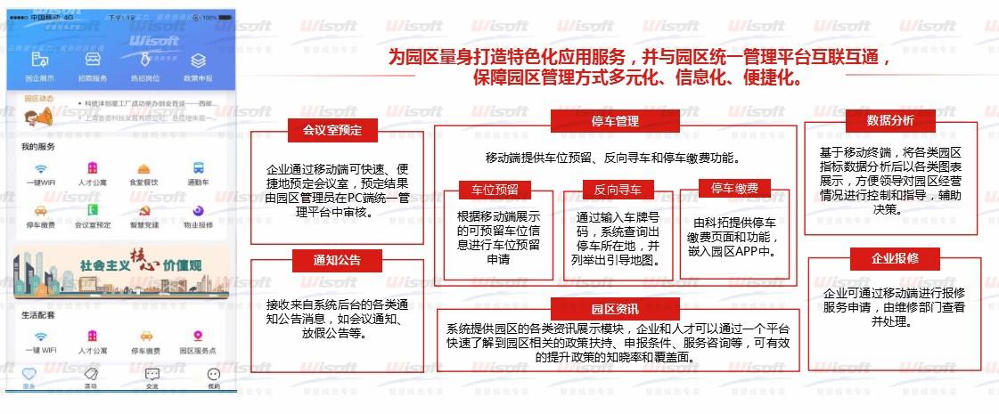 移动应用支持安卓和IOS平台,建设内容如下:集成第三方移动应用、停车管理(车位预留、反向寻车、停车缴费等)、数据分析、通知公告、小镇资讯、报修服务、订餐管理、出行管理。