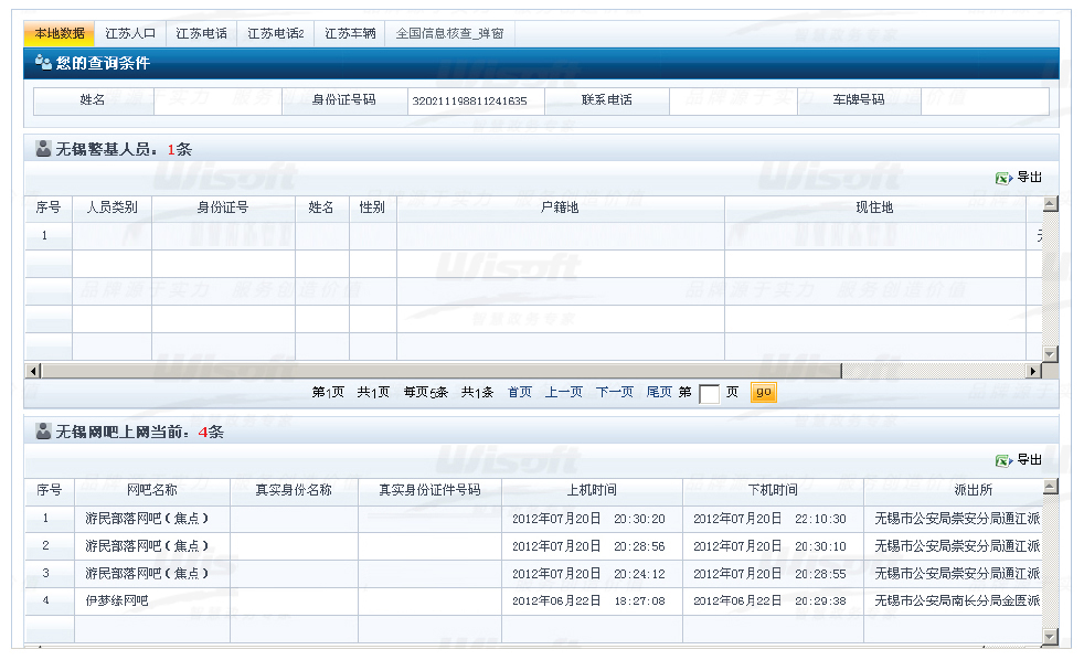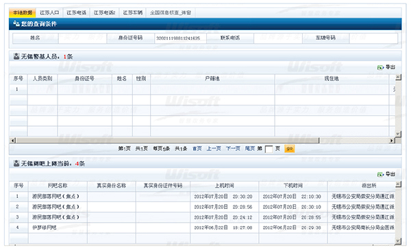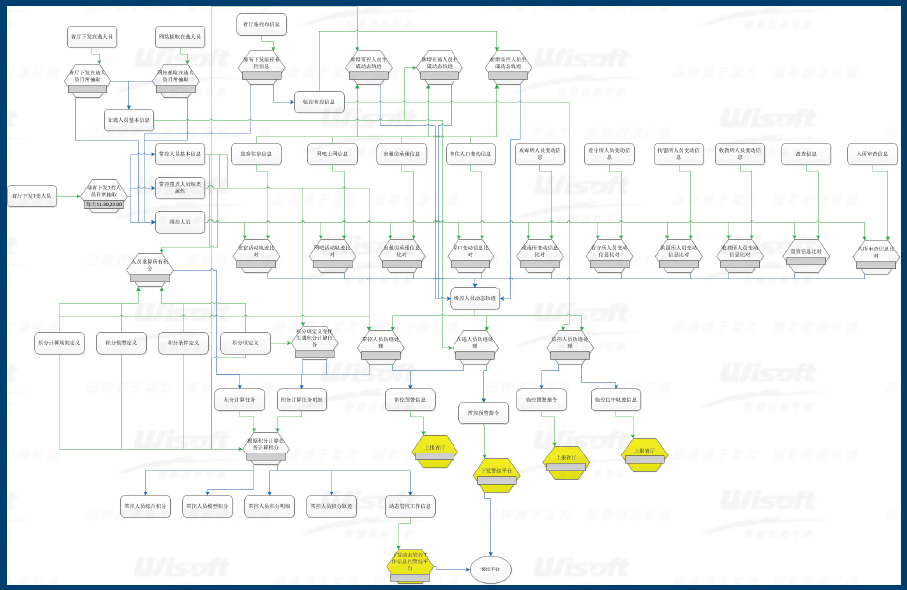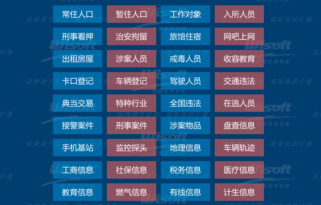 系统使用Wisoft智慧数据交换平台,实现对各类数据的即时交叉比对生成准确及时的各类预警信息;依据固定的研判模型,智能化检索模型所需数据为人工研判提供基础依据。