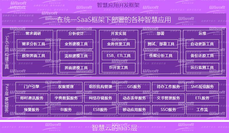 智慧应用集成开发框架在PaaS层封装了大量开箱即用的基础服务。在SaaS层提供了应用构建和开发管理工具,以支持SaaS层的各种智慧应用的开发;应用构建工具采用模型驱动开发思想,通过设计等于实现、文档等于代码的开发模式来创建应用,以满足智慧应用的随需而变、快速上线、边用边做的开发需求。